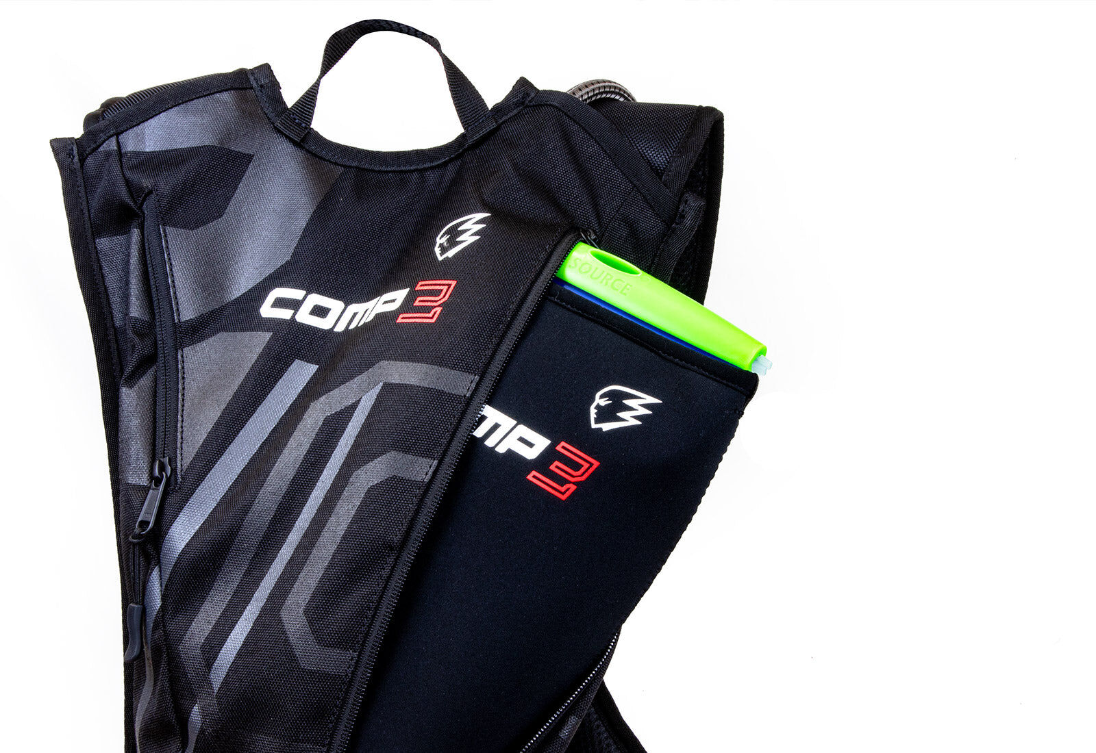 For hydration, the Comp 3 is fitted with a SOURCE 3L Hydration Bladder, that allows up to 3 litres of hydration. This is a high quality design, and with a quick release hose, for easy install and removal.